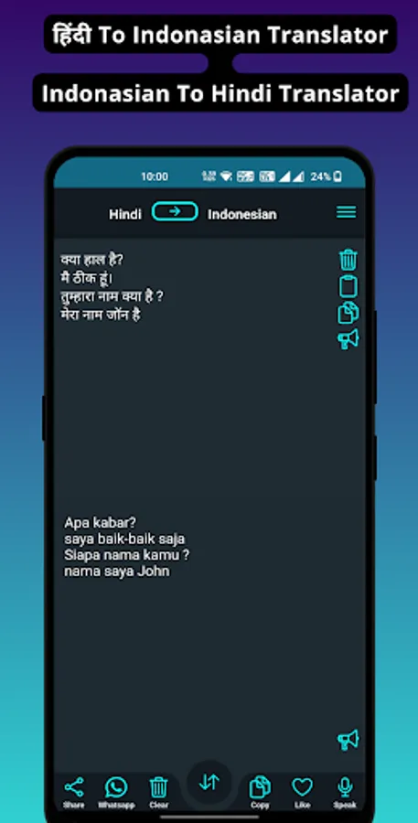 - By using swap button at top you can also type in Indonesian (Bahasa Indonesia) make typing in Indonesian (Bahasa Indonesia) natural. As you type in Hindi character it will be automatically translate it into Indonesian (Bahasa Indonesia) alphabets. When you press the space more words at bottom of screen will appear containing more choice that are relevant to the word you just typed. You can type Indonesian (Bahasa Indonesia) using Hindi letter in a way you speak it. Once you are done with Indonesian (Bahasa Indonesia) typing you can use translate button at bottom to translate Indonesian (Bahasa Indonesia) texts into Hindi.