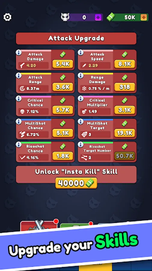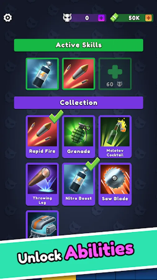 Remember that any upgrades you make during the race will be burned after you lose. But that's okay, shooter! Every defeat is an opportunity to make yourself better, so that the next time you come back to the battlefield you can win. Between battles you have the chance to improve your stats permanently for the money! Moreover, for skull currency you can unlock cards with unique passive and active skills, which you can use with a tap during the fight!