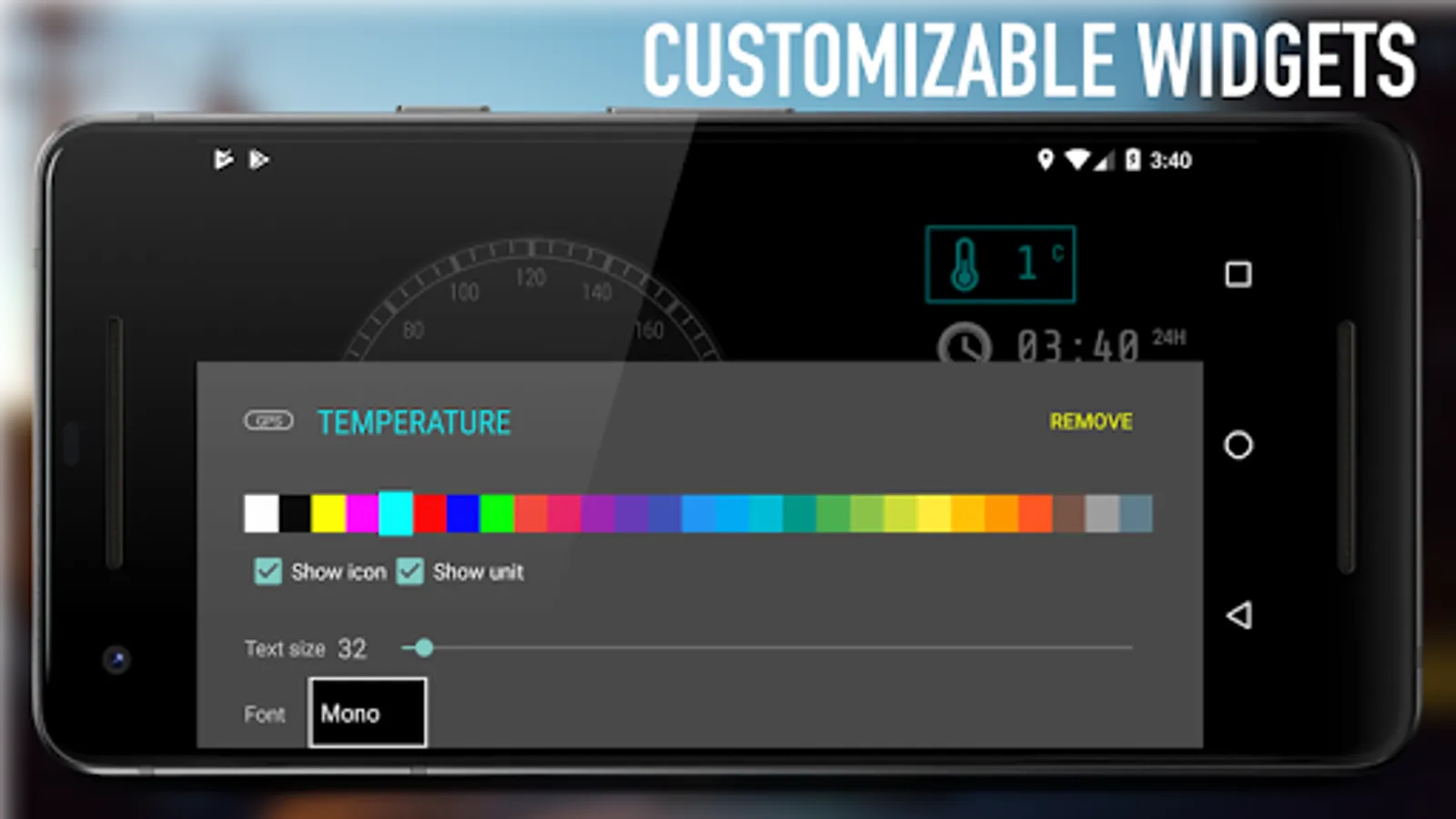 Navier HUD is an information provider for driving. It contains a customizable layout, which is able to put widgets they care and remove what they don't care. Navier HUD calculates the real-time information via the phone sensor, such as GPS and gyroscope. Meanwhile, Navier HUD supports to acquire the vehicle data from OBD2 Bluetooth adapter. Through the data from OBD2 protocol, the information, such as vehicle's speed, engine RPM, and engine coolant temperature can be shown through the interface and which is more accurate than the data from sensors of the smartphone.