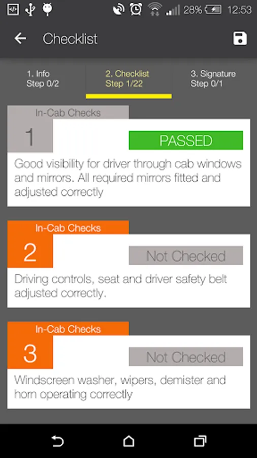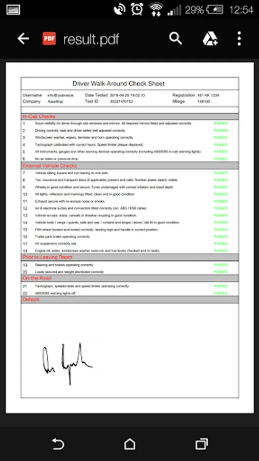 Each check is mandatory and tamper proof ,a signature is recorded at the end of the test. This report can be shared or accessed from our web portal. The inspection results are automatically updated .