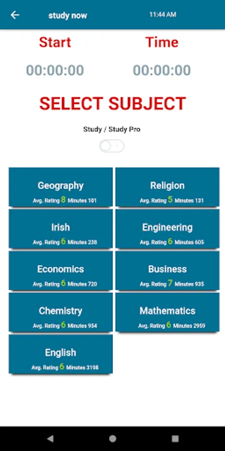 · Study Now – Select your subject, start your study and rate your session when you finish. At a glance see here your subject’s average rating, the number of quality minutes you’ve studied and what subjects need more attention.