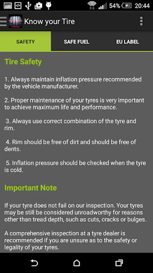 The makers of this app will not be held responsible in any way for any decision you make regarding the result of each test.You should always check with your local tire dealer to validate a tire if you are not sure. Also check tire walls and tire pressure at regular intervals to ALWAYS STAY SAFE.