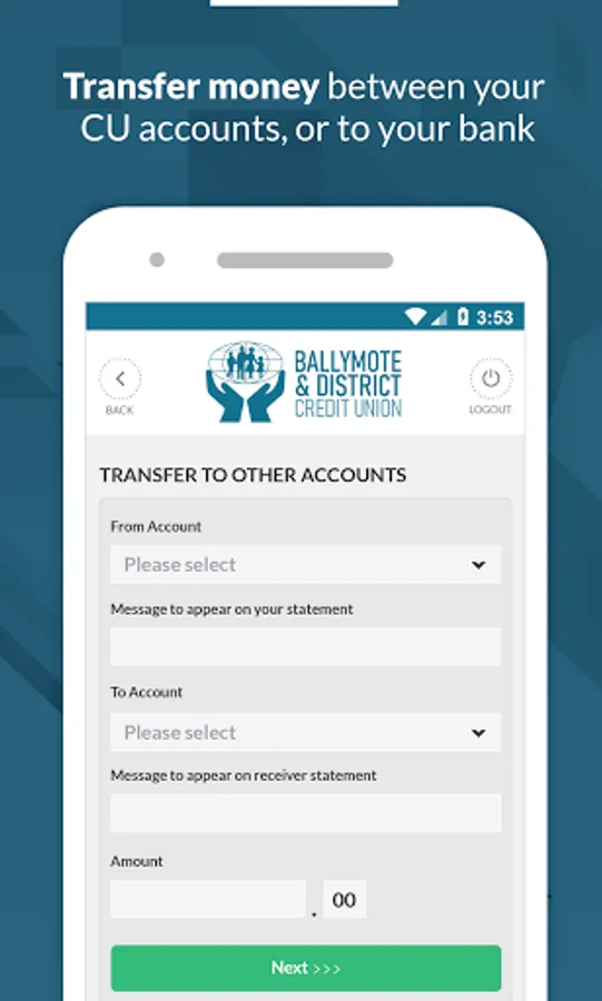 You will be asked to review, and accept, our Terms and Conditions. These can also be viewed at www.ballymotecreditunion.ie. Please note, all external accounts and utility bills must have already been registered through your Online Banking account, prior to using the App.