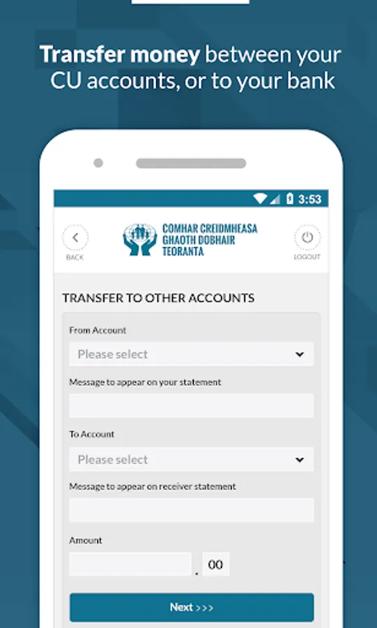 All external accounts and utility bills must have already been registered through your Online Banking on www.english.gaothdobhaircu.ie Online Profile in order to access them and perform above services on the CC Ghaoth Dobhair App.