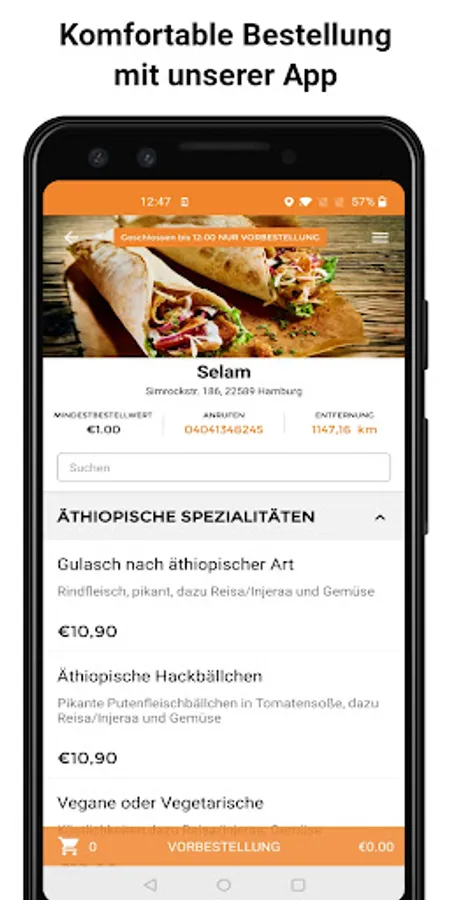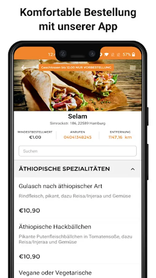 Selam Restaurant ist der Ort, an dem Sie gehoben dinieren können. Äthiopien ist nicht nur das Ursprungsland des Kaffees, es bietet auch eine ganz eigene Küche. Bei uns finden alle, wonach sie suchen: ob vegane, vegetarische oder fleischhaltige Gerichte. Jeden Tag wird für unsere Kunden und Kundinnen mit Liebe frisch zubereitet. Hausgemachte Hummus, Fettira, Kitta, Falafels, Sambusas und Frühlingsrollen sind unsere Highlights! Selam Restaurant bietet Ihnen hochwertige äthiopische und orientalische Spezialitäten sowie europäische Gerichte mit äthiopische Gewürze an. Kinder unter 10 Jahre bei uns zahlen halb Preis.