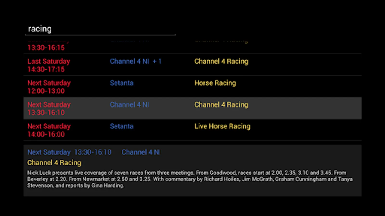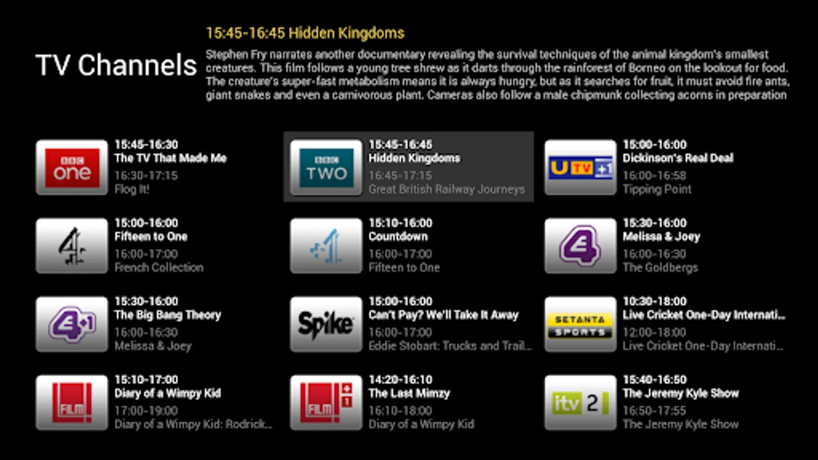 Channels include RTE, Virgin Media, BBC, UTV, Channel 4, Film 4 and numerous other channels.