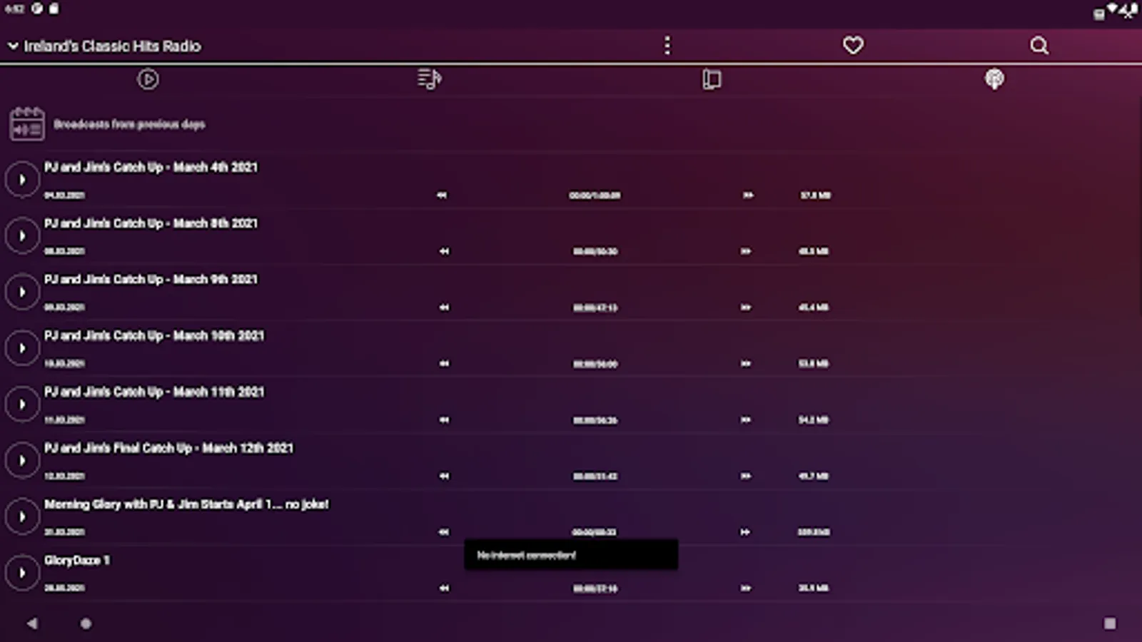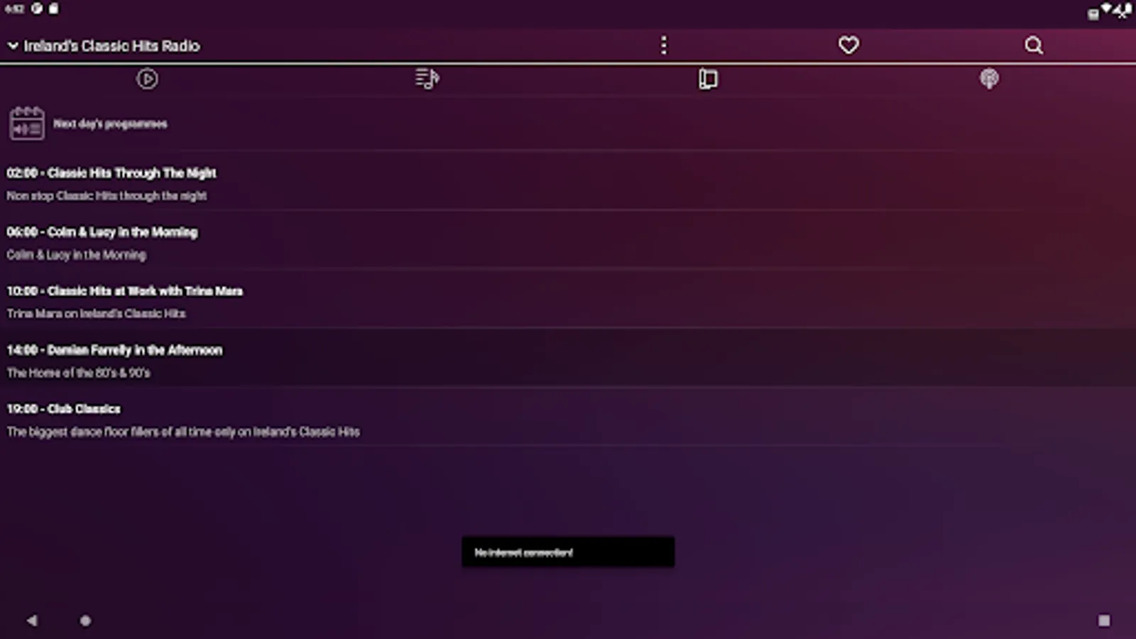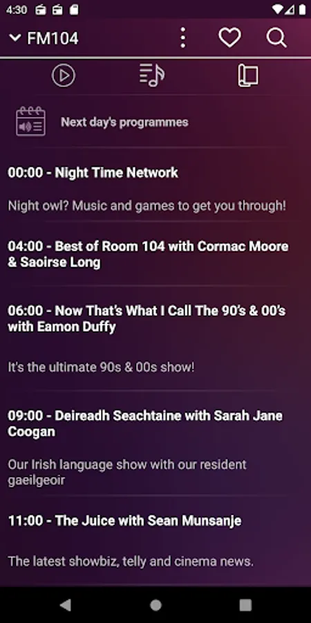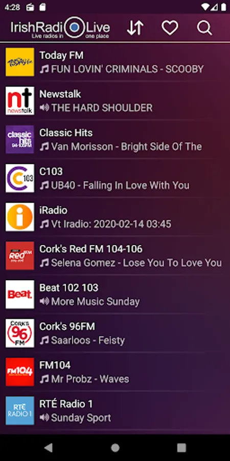A radio app for our Irish online radio collection site, irishradiolive.com, which currently has a fraction of the web interface, but we aim to have all the features available through the app in the future. You can listen to more than 100 online radio stations in Ireland. While listening to a radio, You can see the actually played song's title and cover, and You can search in the radio's playlist back for a month. Moreover, some radios have schedule, which shows the programmes one week ahead. Some radios support the webcam view, so they can be viewed, not just listened to. Look for this function on the radio's page header. You can set the actually listened radio as favourite, so later can be found easily. The paid version contains broadcast-recording, and song-recognition function, and its interface is free of advertising. You can find below the partial list of the available radios in the application. If You don't find your favourite radio, You should try to click on the search icon, on the header of the application, type the radio's name, and launch the search for it. The search-function supports the voice-based search, in case of You can't type.