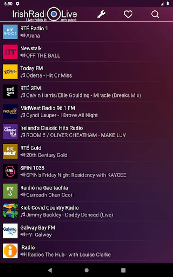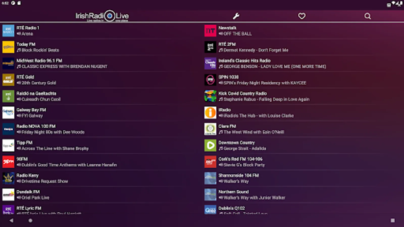RTÉ Radio 1, Newstalk, Today FM, RTÉ 2FM, MidWest Radio 96.1 FM, Ireland's Classic Hits Radio, Cool FM, RTÉ Gold, SPIN 1038, iRadio, Raidió na Gaeltachta, Radio NOVA 100 FM, Downtown Country, Galway Bay FM, Downtown Radio, RTÉ Lyric FM, 98FM, Clare FM, Cork's Red FM 104-106, Dundalk FM, Tipp FM, Northern Sound, Shannonside 104 FM, Beat 102 103, Radio Kerry, Dublin's Q102, FM104, Sunshine 106.8, Cork's 96FM, C103, SPIN South West, Naas Radio Online, Ocean FM 102.5 - 105, WLR FM, Highland Radio, KCLR 96FM, Kick Covid Country Radio, South East Radio, Live 95, Kfm Radio etc.