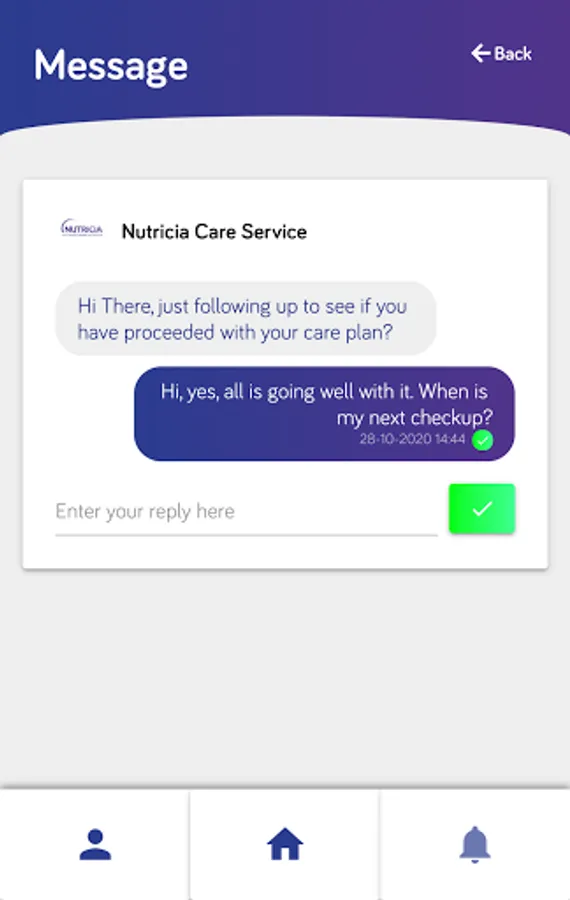 Our Nutricia Care app allows our dedicated team of Health Care Professionals to easily arrange onsite or virtual visits (by video call) with our Nutricia Care Partner Nursing Homes. Video calls hosted within the system are via a state-of-the-art peer-to-peer encrypted video conferencing facility that ensures video calls are always fully secure.