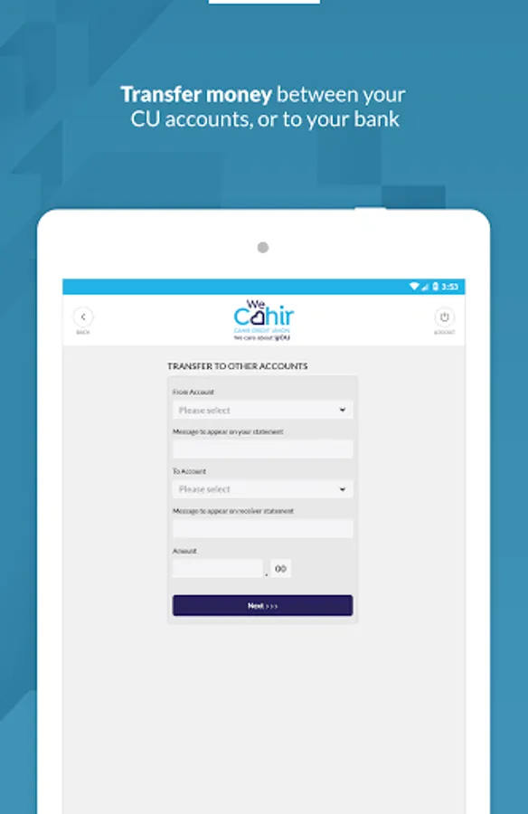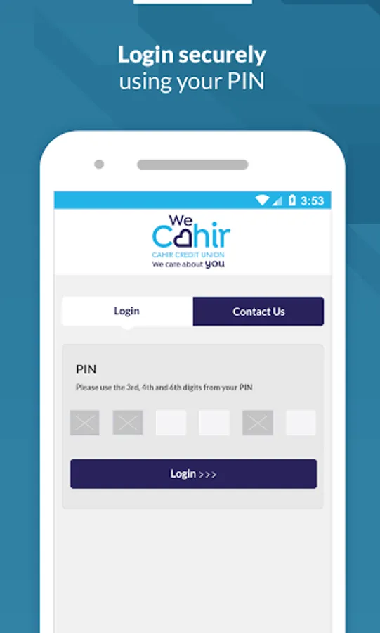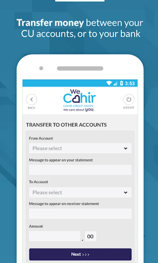 You will be asked to review, and accept, our Terms and Conditions. These can also be viewed at www.cahircu.ie. Please note, all external accounts and utility bills must have already been registered through your Online Banking account, prior to using the App.