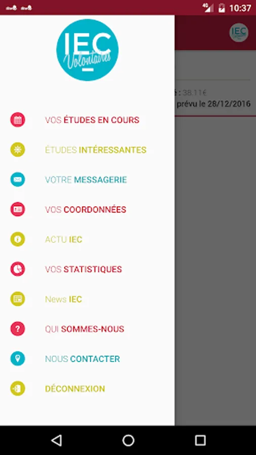 "IEC Volunteer" is an application dedicated volunteers already part of our panel: This application has been designed for you to improve your comfort in tracking your daily studies.