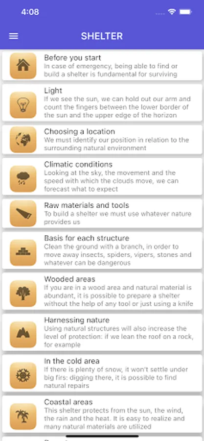 Application is a structure following 5 basic rules:will, shelter, fire, signaling, water and food.