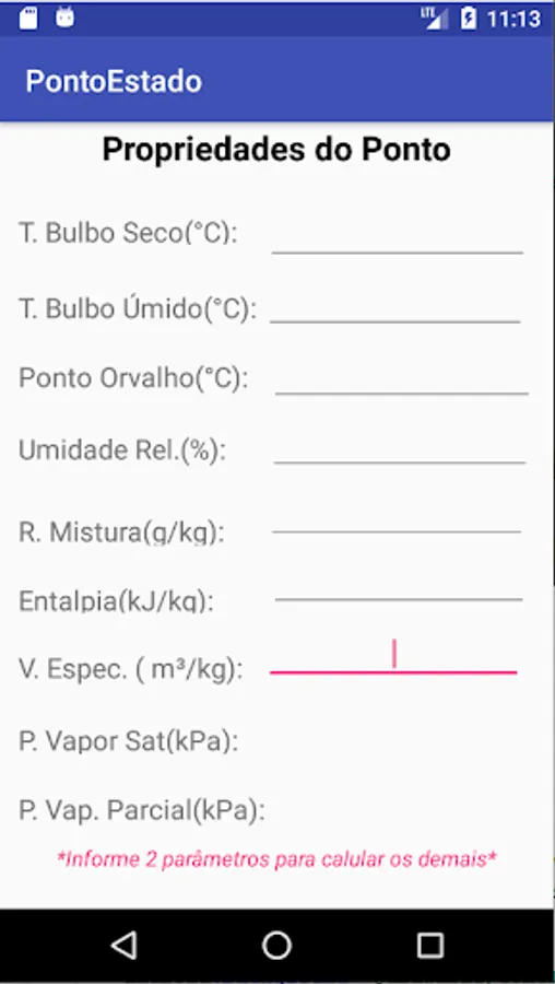This application allows the calculation of the various air properties, considering as input parameters only altitude, dry bulb temperature, plus ONE of the following properties: Wet Bulb Temperature OR Dew Point OR Relative Humidity OR Specific Enthalpy or Volume OR Mixing Ratio .