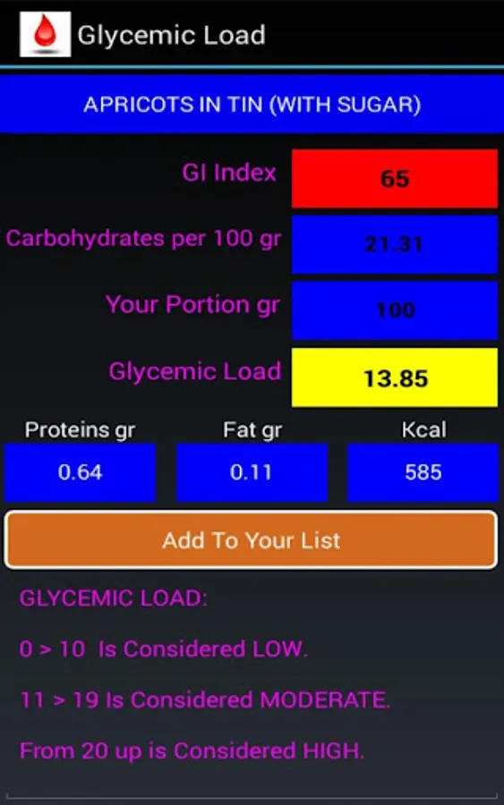 From your list you can add to the dish of the day. And see the total values (GL, Carbohydrates, kcal, Proteins, Fats).