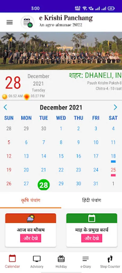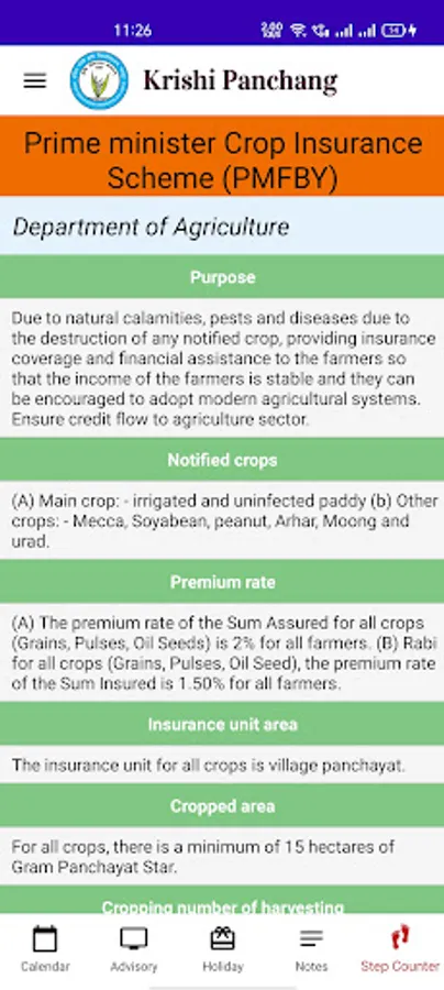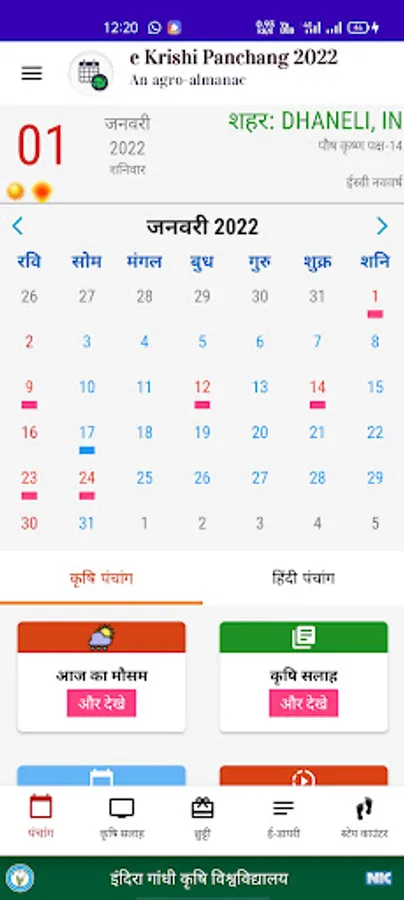 e-Krishi Panchang or Agro-almanac is an agricultural guide calendar giving calendrical information on various aspects of agriculture and allied activities, basically suggesting block-wise, season-wise and crop-wise crop strategy based on climate and location, giving auspicious time for undertaking various farm related operations, along with a list of holiday, muhurat, festivals and all other information of hindi panchang. It is very useful for the farming communities.