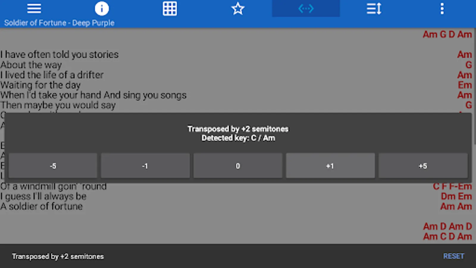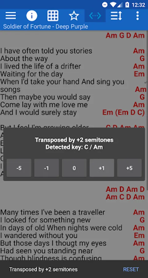 - Several chord notations: English ("Am Bbm Bb B C Dm"), German ("a b B H C d"), Solfege, Dutch, Japanese