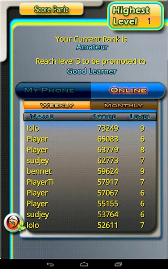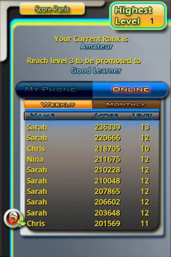 Online Scores! Scores of top ten players from all over the world are listed in weekly and Monthly tabs of our online score screen. At any time, you can compete with top ten weekly and monthly scorers and submit your scores after every game.