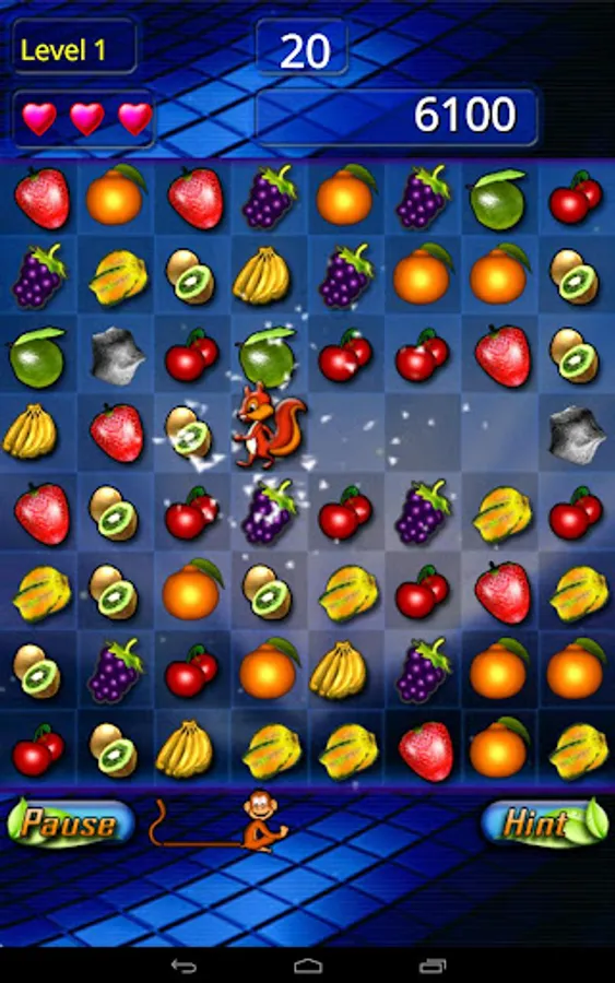 - Animated squirrels clears all fruits in a row or column, if you excite them with a nice combo of fruits adjacent to them