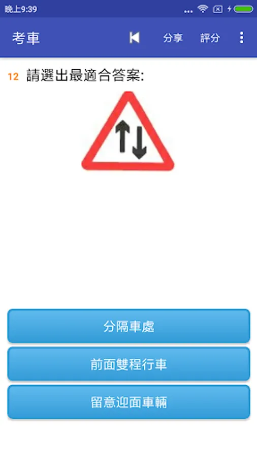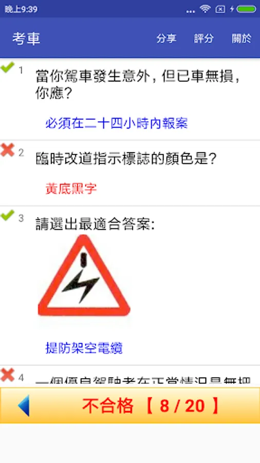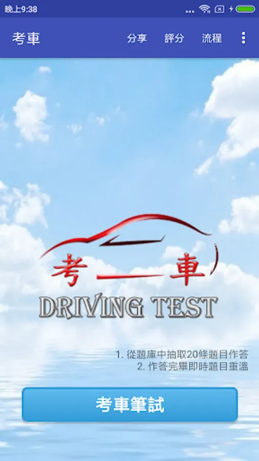 【考車】每次隨機從題庫中抽取 20 題作答。答對 16 題或以上為合格。作答完畢即時重溫是次練習所的題目及答案。