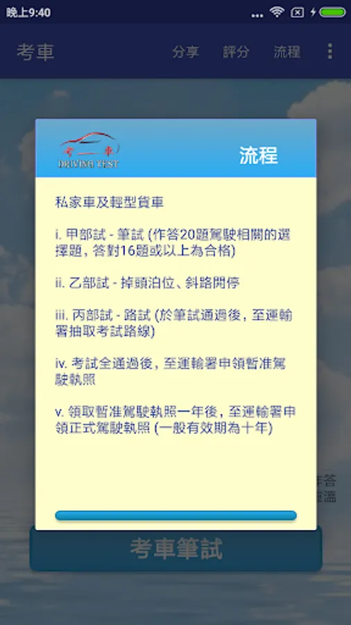 i. 甲部試 - 筆試 (作答20題駕駛相關的選擇題,答對16題或以上為合格)