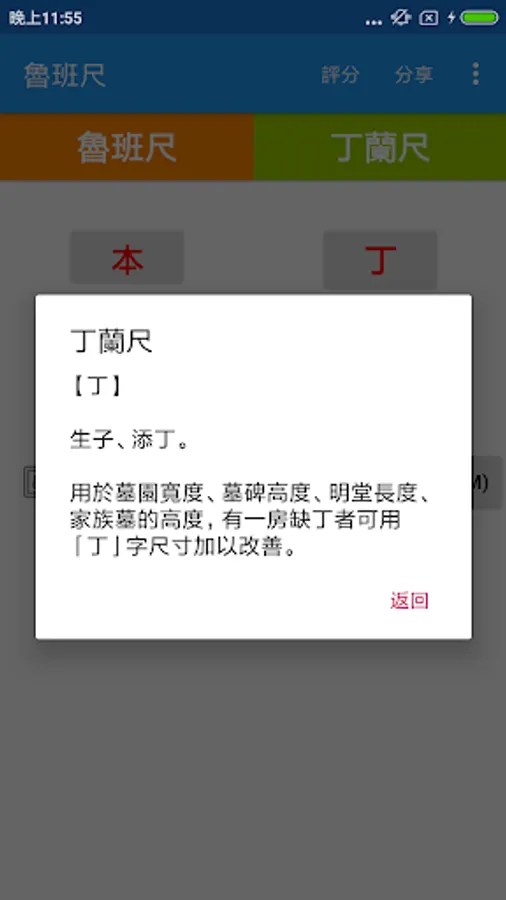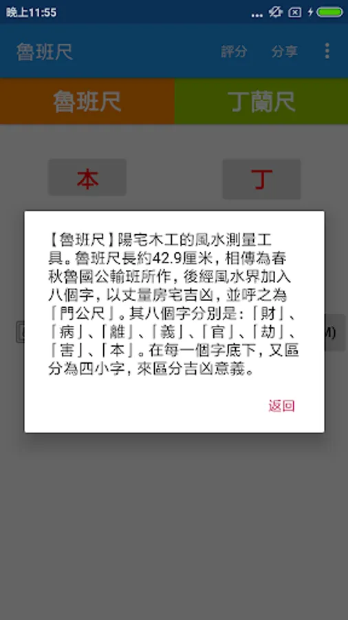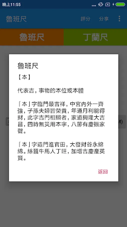 [Luban ruler] Feng Shui measurement tool for woodworking in Yangzhai. The Luban ruler is about 42.9 centimeters long. According to legend, it was made for the Spring and Autumn Lu Guogong class. After the eight words were added by Feng Shui, the house was measured and used as a "door ruler". The eight characters are: "Finance", "Illness", "Leave", "Yi", "Official", "Robbery", "harm" and "本本". Under each word, it is divided into four small characters to distinguish the meaning of good and bad.