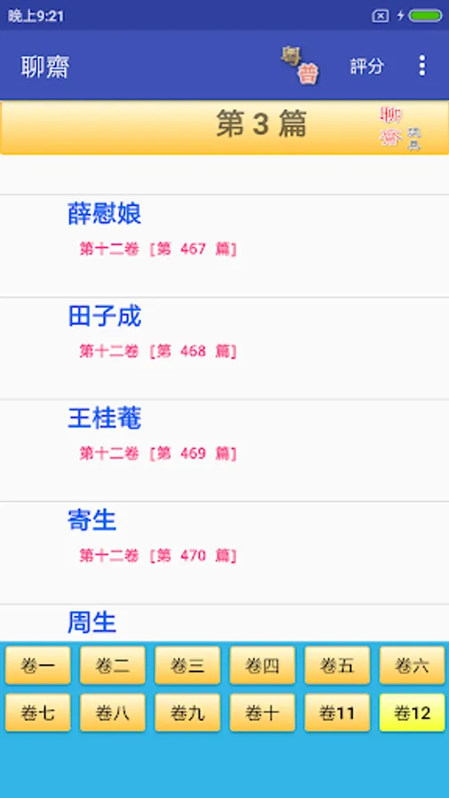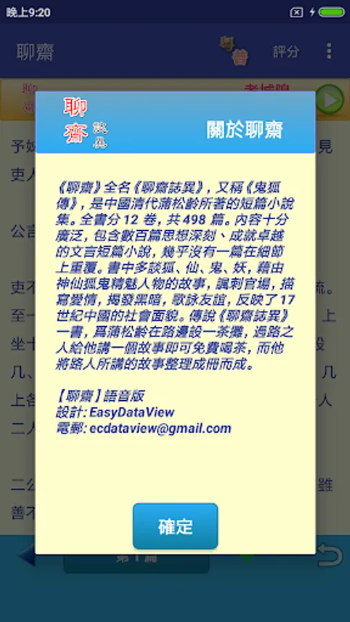 《聊齋》全名《聊齋誌異》,又稱《鬼狐傳》,是中國清代蒲松齡所著的短篇小說集。全書分 12 卷,共 498 篇。內容十分廣泛,包含數百篇思想深刻丶成就卓越的文言短篇小說,幾乎沒有一篇在細節上重覆。書中多談狐、仙、鬼、妖,藉由神仙狐鬼精魅人物的故事,諷刺官場,描寫愛情,揭發黑暗,歌詠友誼,反映了 17 世紀中國的社會面貌。傳說《聊齋誌異》一書,爲蒲松齡在路邊設一茶攤,過路之人給他講一個故事即可免費喝茶,而他將路人所講的故事整理成冊而成。