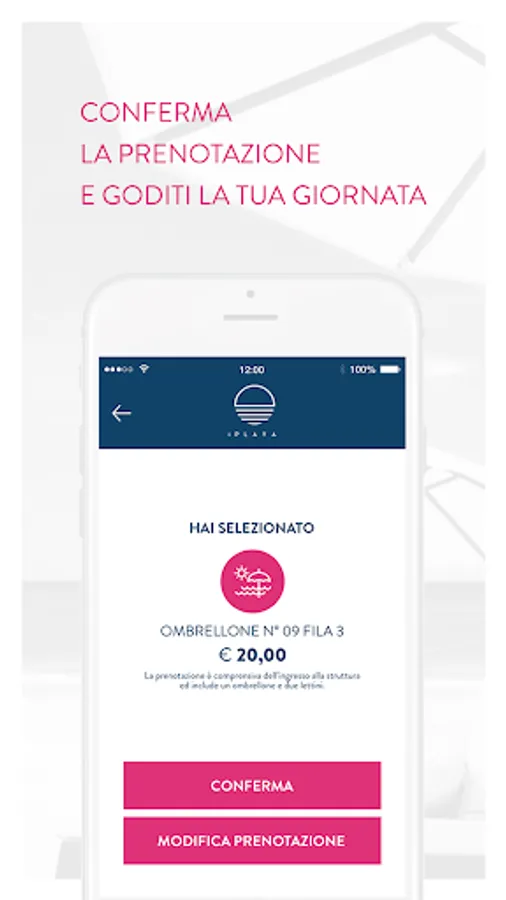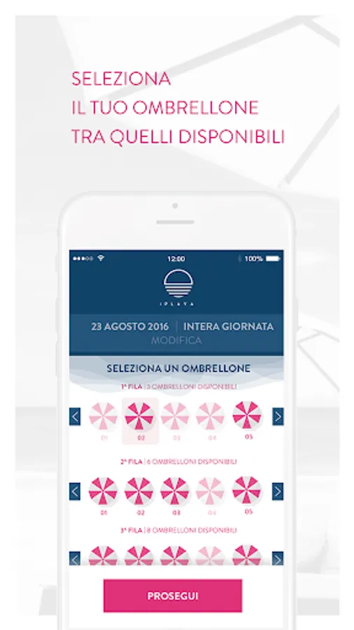 Access to iPlaya, indicating the date on which you want to make a reservation and the preferred time slot (morning, afternoon or full day), then select an umbrella from the selection and confirmation of your booking. Now you're ready to enjoy your day at the beach.