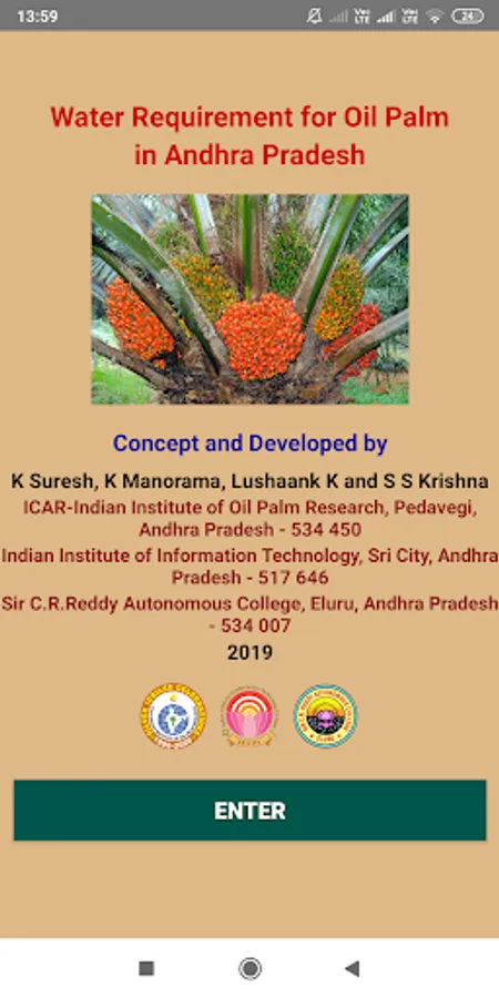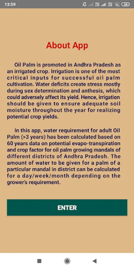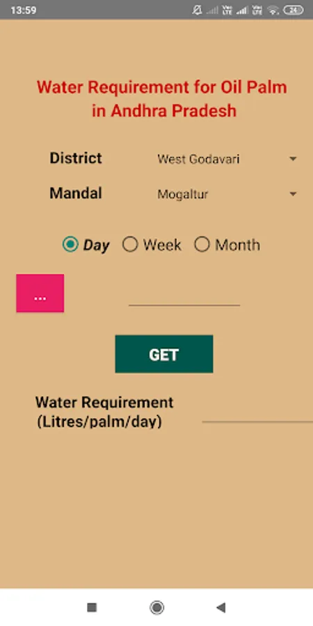 In this app, water requirement for adult oil palm (more than 3 years) has been calculated based on 60 years data on potential evapo-transpiration and crop factor for oil palm growing mandals of different districts of Andhra Pradesh. Using this app, the oil palm grower can know the amount of water to be given for a palm of a particular mandal in district on a given day/week/month.