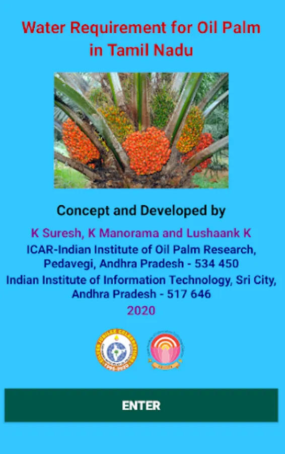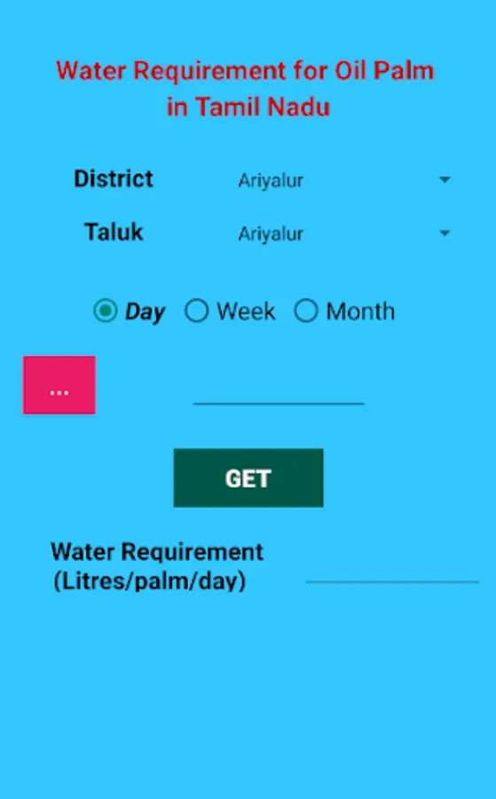 In this app, water requirement for adult oil palm (more than 3 years) has been calculated based on 60 years data on potential evapo-transpiration and crop factor for oil palm growing taluqs of different districts of Tamil Nadu. Using this app, the oil palm grower can know the amount of water to be given for a palm of a particular taluq in district on a given day/week/month.