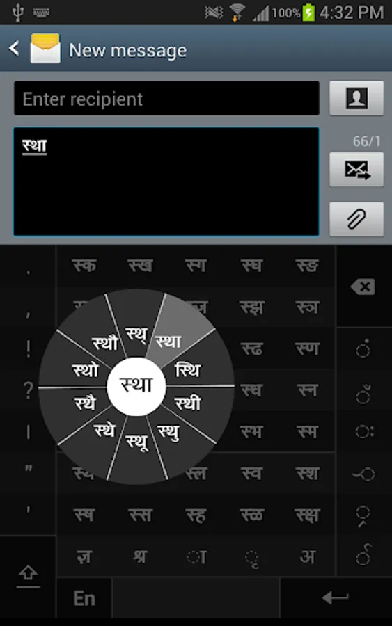 Typing conjuncts like क्रि, स्थ, च्य is particularly hard for most people. Swarachakra makes it easy. First tap on the first part of the combination and select the halant from the chakra (स + ्). Swarachakra then shows a preview of all possible conjuncts that begin with that consonant (स + ् + त = स्त; स + ् + थ = स्थ etc.). If you need to add a matra, select it from the new chakra like earlier (स्था, स्थि, स्थी, स्थु, स्थू...).