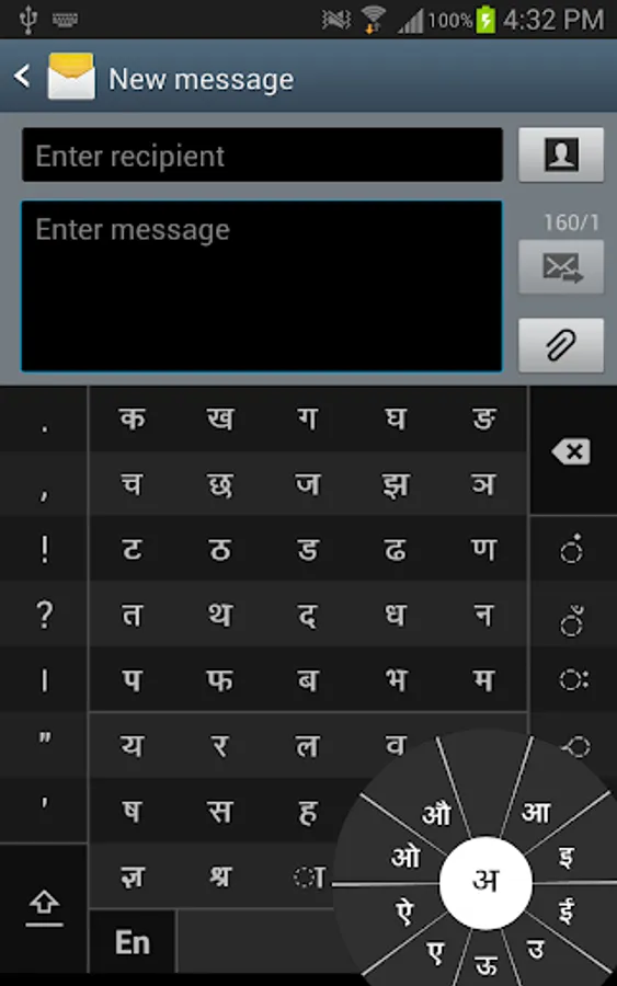 Complete vowels (अ, आ, इ, ई, उ, ऊ, ए, ऐ, ओ, औ) appear in a separate chakra on the bottom right. The less used vowels and matras are next to it (ऽ, ऑ, ृ, ऋ, ॄ, ॠ, ॆ, ॊ, ॅ, ॉ,). Numerals, symbols and rarely used characters appear on a shift. You could also switch to the QWERTY keypad temporarily to input English characters.