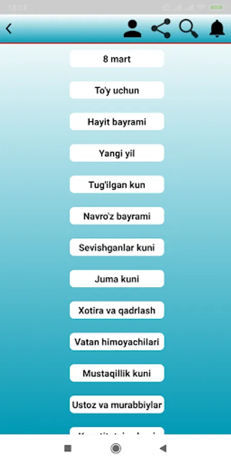 Tabrik so'lar va she'rlar uzbek tilida - bu dasturda chiroyli tushuntirishlar mehmonlarimiz uchun yordamchidir. Chiroyli tabriklash uchun bu dastur. Sevgi va muhabbat sherlari o'zbek tilida.