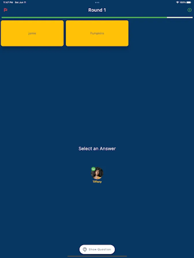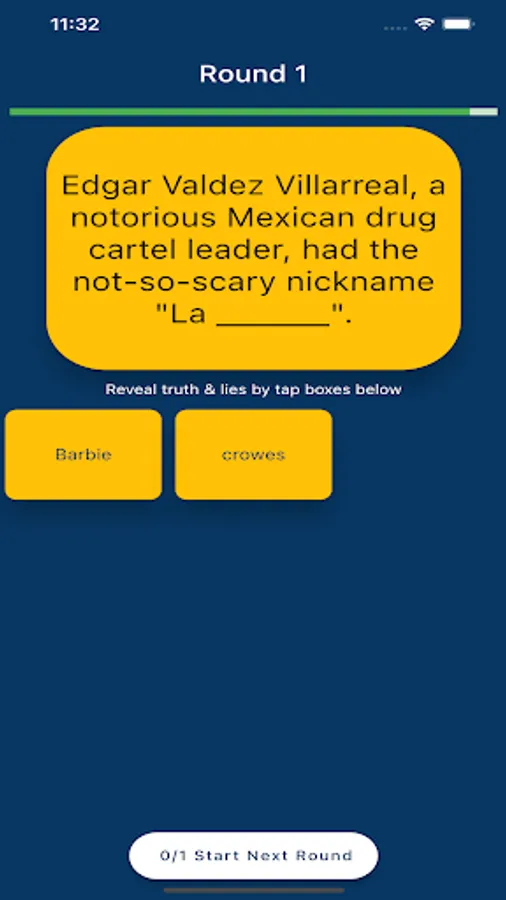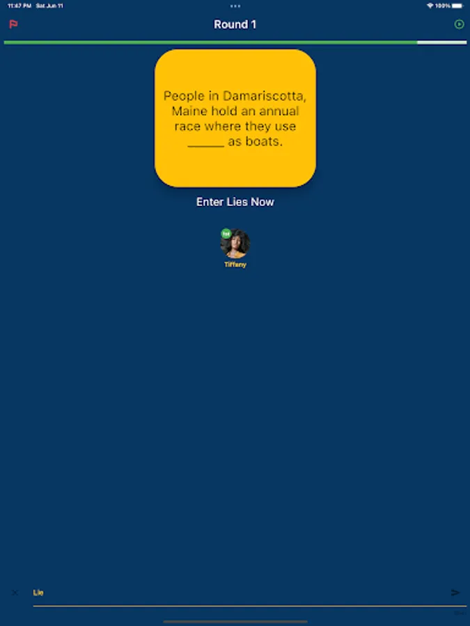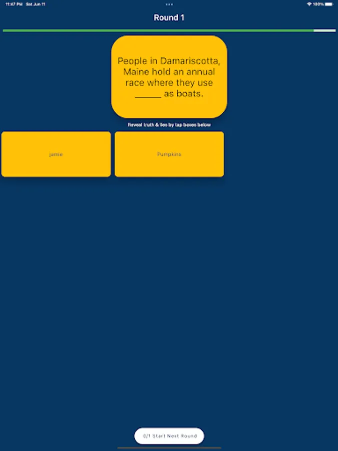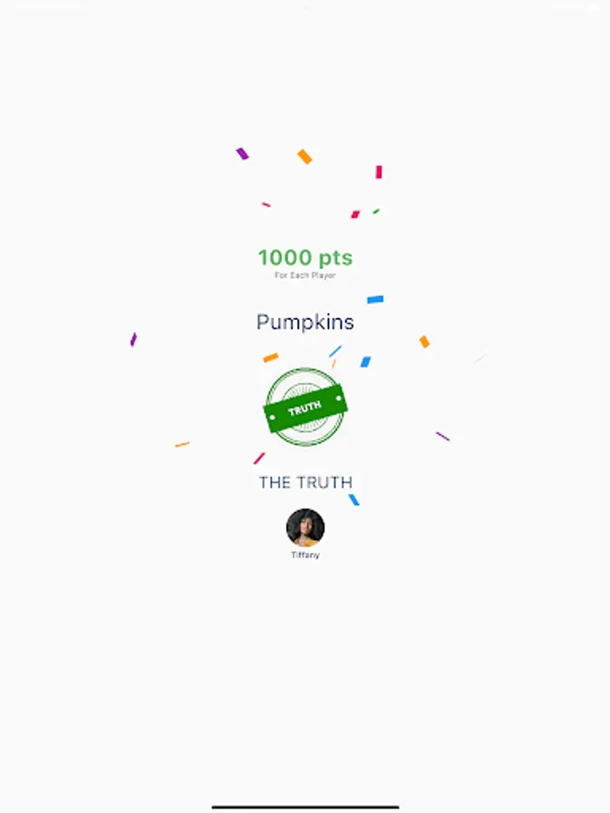 Each round is simple: There is a statement on the screen with a missing word and you have to supply the incorrect answer to fool your friends into guessing it. You will get points if you choose the correct answer supplied by the game itself. If somebody else chooses your incorrect answer, you will also receive points.