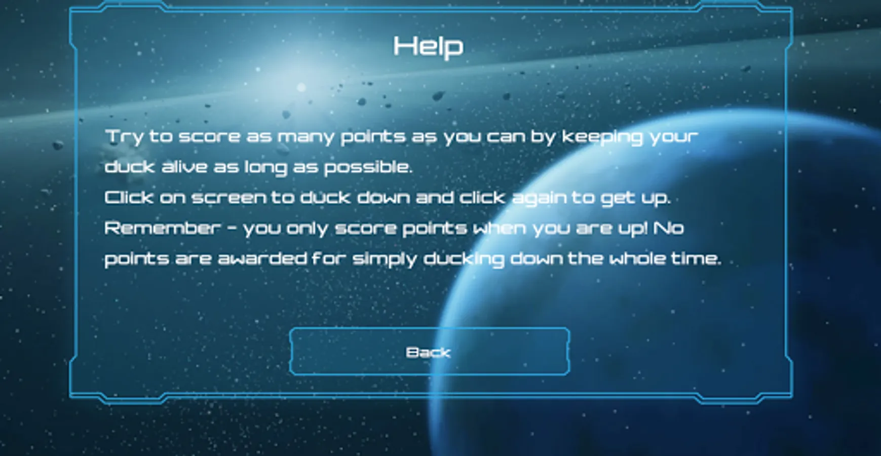 Duck down to avoid the shots but remember - you only score points when you are upright.