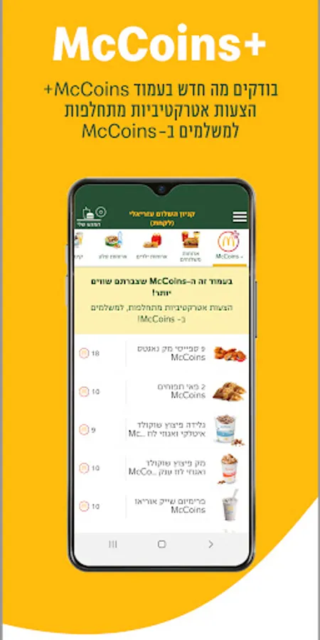 בכל תשלום מ- 25 ₪ צוברים מק קויינס לשימוש כבר בקנייה הבאה :) מזמינים מה שאתם רוצים באפליקציה, משלמים ורואים כמה מק קויינס צברתם בקנייה. תוכלו להשתמש במק קויינס שלכם כבר בקנייה הבאה. קונים יותר, צוברים יותר ומשלמים פחות!