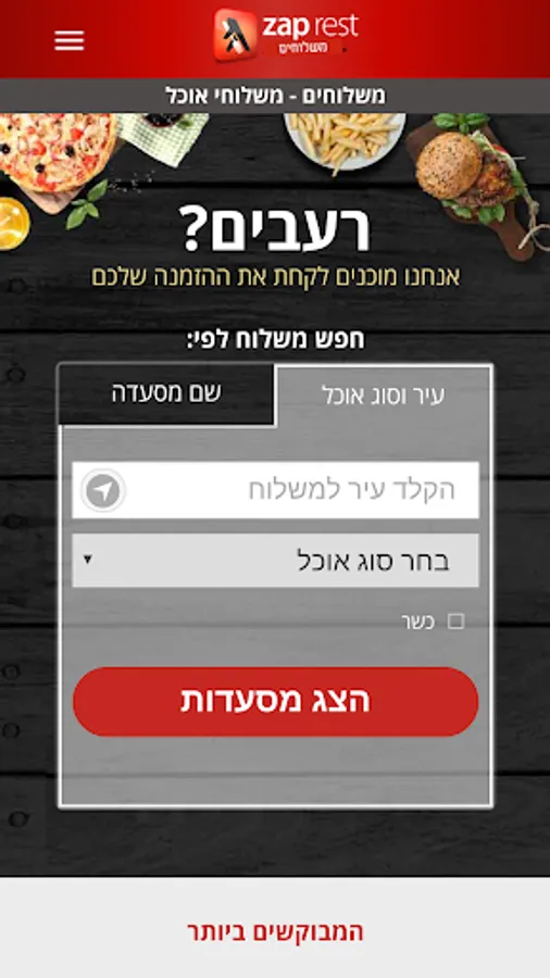 You get to the latest application of Mishlohim (deliveries) Zap Rest. By using the innovative app, you can book by phone or on-line food deliveries from 1,500 restaurants in the simplest and shortest way via cash or credit card.