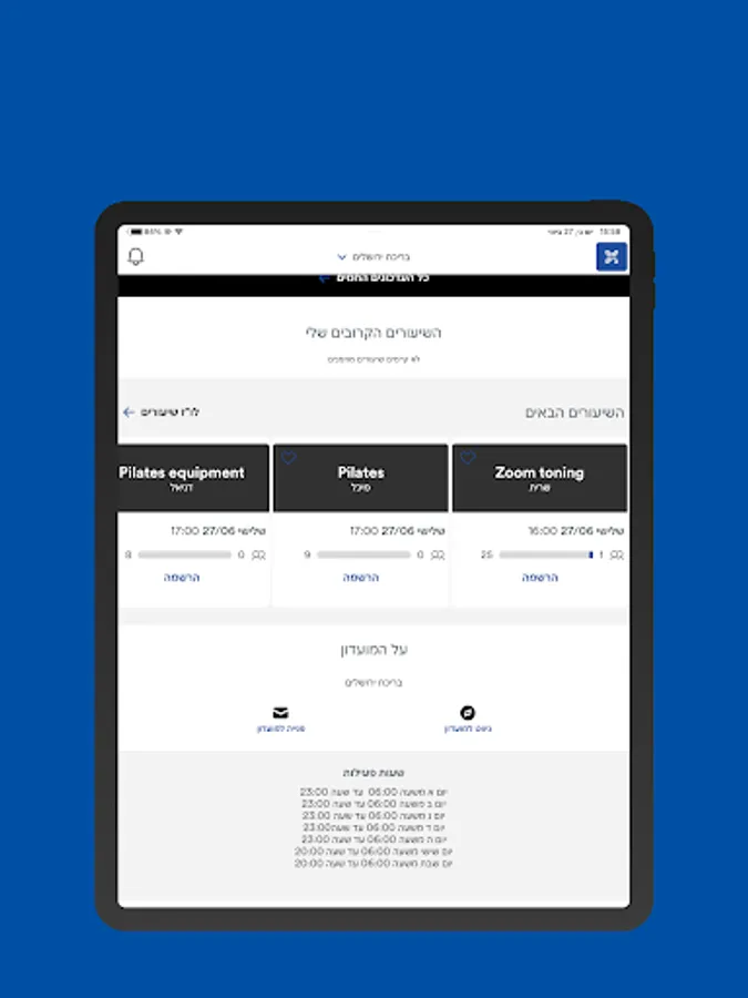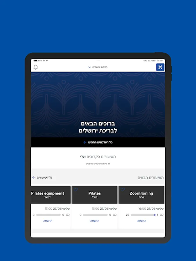 New! From today, all contact with the sports center of the Jerusalem pool is on your smartphone. Everything you need to know for pre-registration for studio classes, yoga, Pilates equipment, and more. Reserve a place in the classes, mark your favorite classes, display the classes of your favorite instructor. It is no longer necessary to wait for the receptionist at the club to perform the actions related to your subscription. Registration for classes and a reminder in the diary, subscription status, request to freeze the subscription, write a direct request to the club, display the system of classes in the club, navigate to the club, display special offers offered to customers and their sale, messages from the club regarding changes in the system and various events and more
