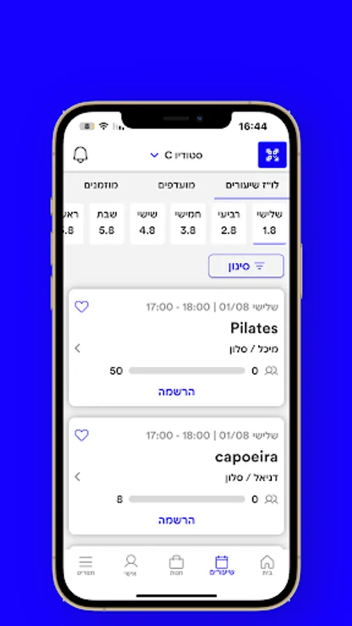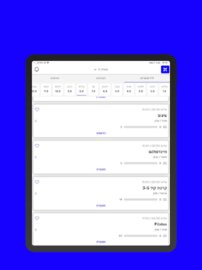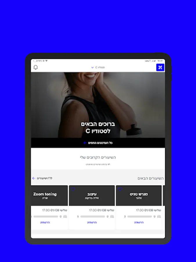 כאן באפליקציה תוכלי למצוא את כל האימונים והשיעורים שלנו, להירשם אליהם, לקרוא על המדריכים, לארגן לעצמך את הלו"ז ולשים תזכורות ביומן.