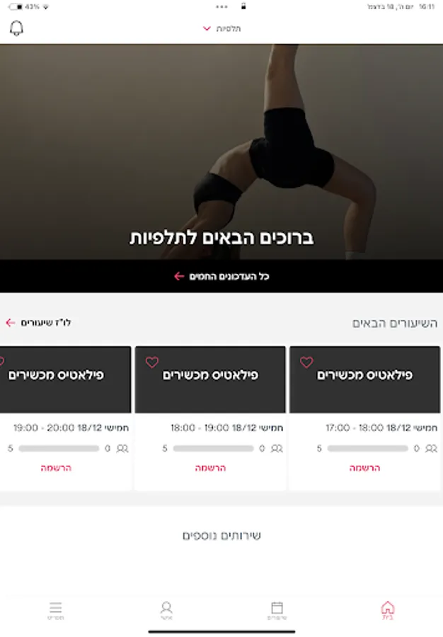 Welcome to the We Fit app! It's time to take your workout routine to the next level. With the new app of We Fit, the leading boutique studio in Jerusalem and the surrounding area, you can sign up for a variety of workouts and enjoy a fitness experience tailored specifically for women.