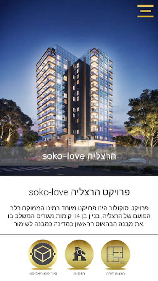 An application that allows you to enjoy the variety of projects by Yossi & Aviv. In each project you can view the typical apartment plans, interior and exterior simulations and photo-realistic tours