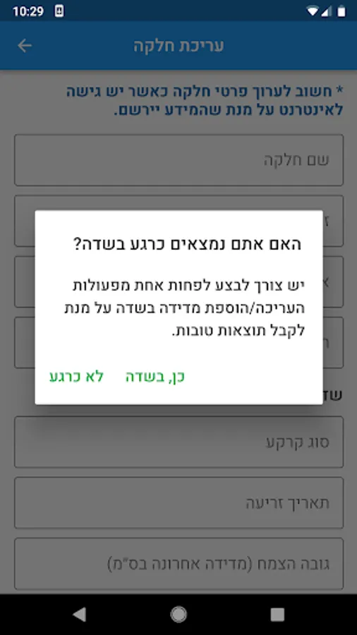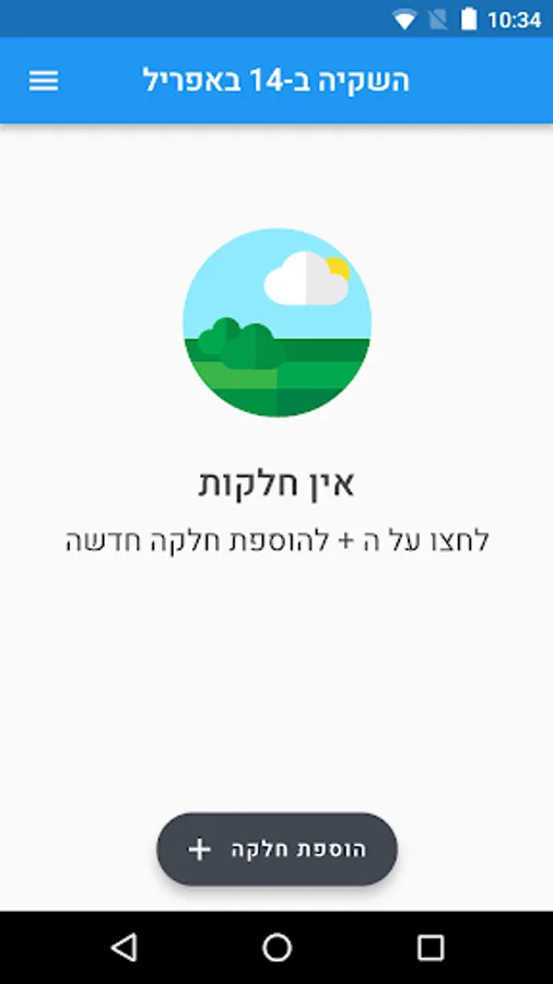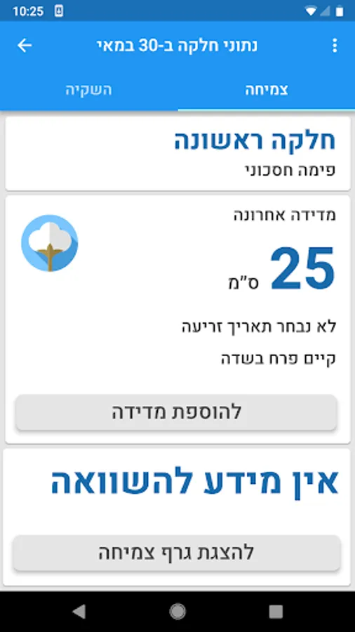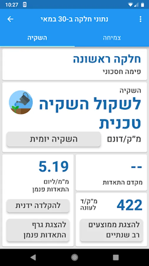 האפליקציה מאפשרת למגדל להוסיף חלקות לרשימה, ולראות המלצה יומית למקדמי השקיה לכל חלקה.