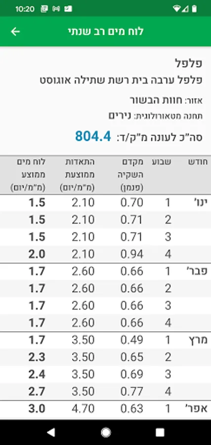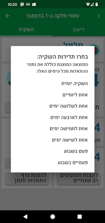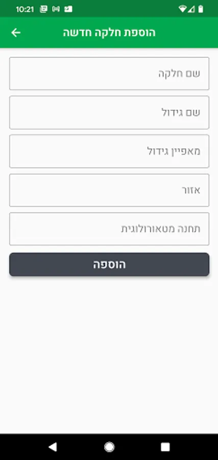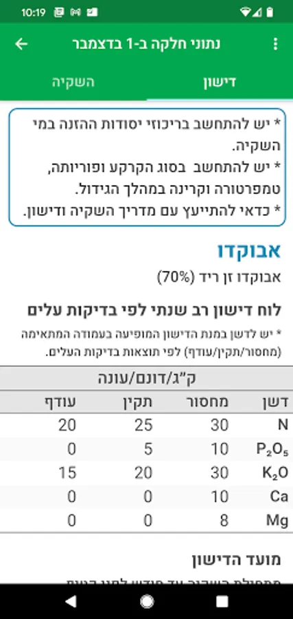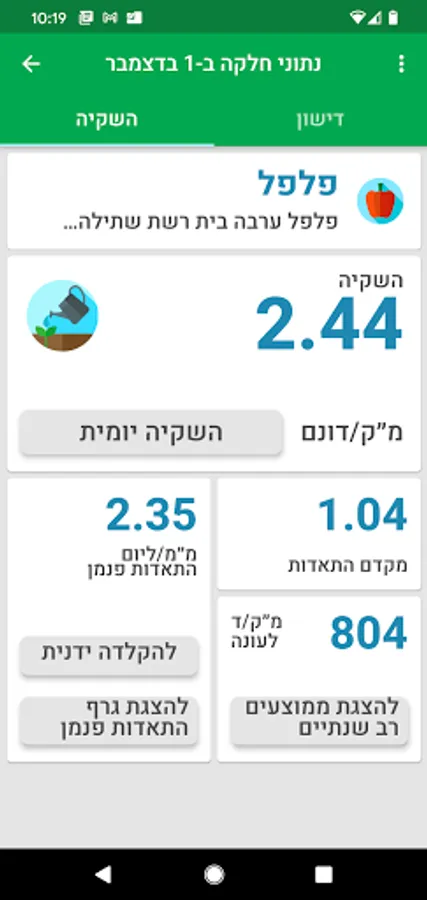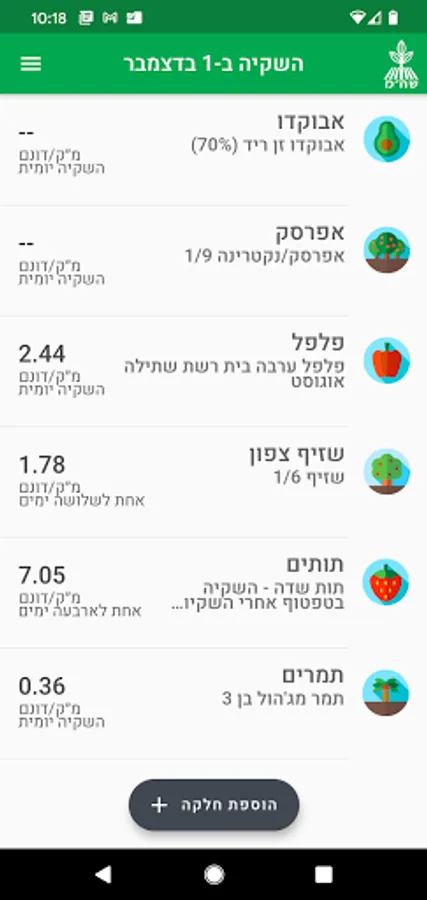 האפליקציה מאפשרת למגדל להוסיף חלקות לרשימה, ולראות המלצה יומית למקדמי השקיה ולדישון לכל חלקה.