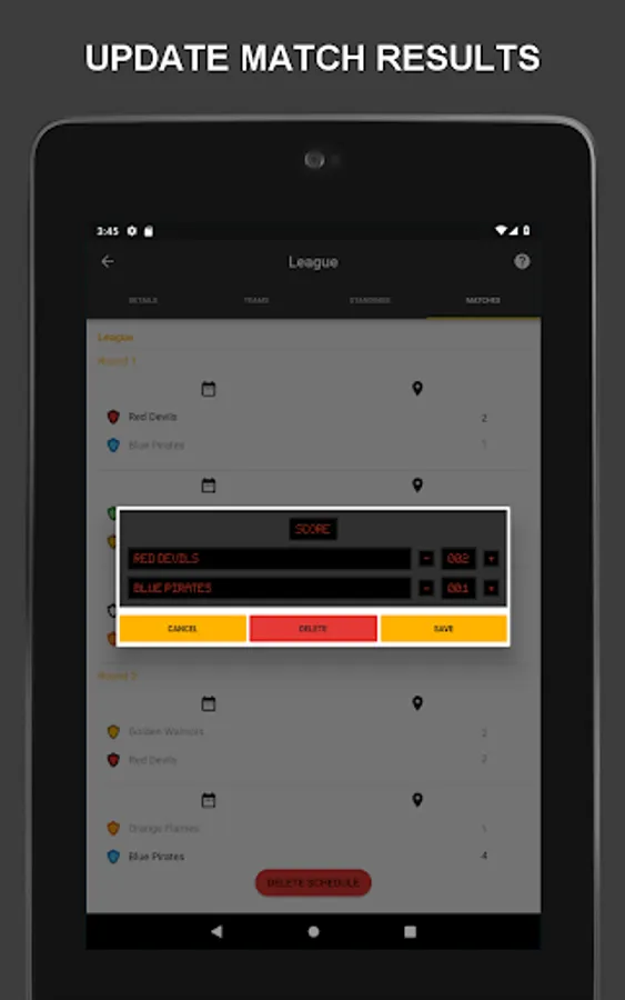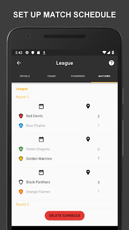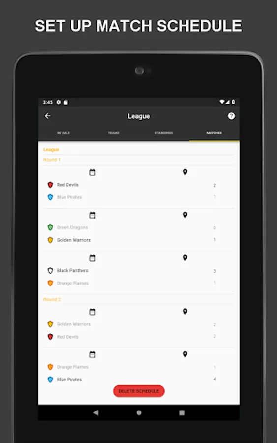 With Winner you can create a match schedule for your tournament manually or randomly, and edit the match teams or players, date, time and location.
