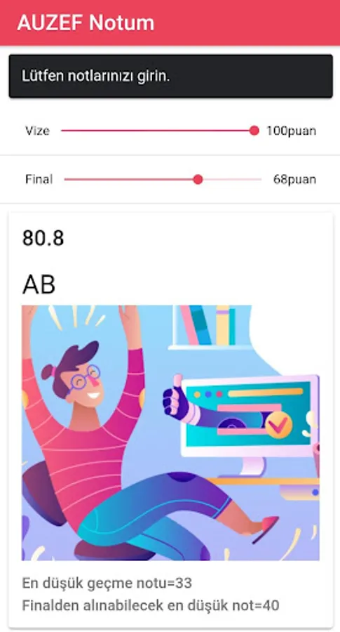 AUZEF Notunuzu harf notuyla beraber hesaplamanızı sağlar. Harf notu verileri okulun online kaynaklarından alınarak hazırlanmıştır fakat çan eğrisi hesaba katıldığında değişiklik gösterebilir. Yine de size notunuz hakkında bir fikir sağlayabilir