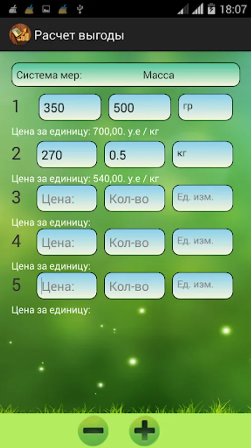"Benefit and Cost Calculator Pro" - the best application for comparing prices and calculating the cost of goods. This application is a trial version, where you can find out the unit cost of the goods and compare the prices of two or more products. Using the app "Benefit and cost calculator", you can be sure that you are making a bargain.
