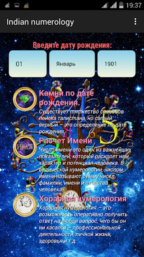 "Indian numerology" contains all the necessary information about the secrets of your fate, name, personal qualities and purpose. And also you can use the "Hierarchical numerology". Hular numerology is an opportunity to promptly receive an answer to any question, whatever it may concern - professional activity, personal life, health, etc.