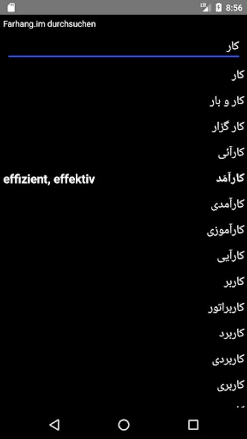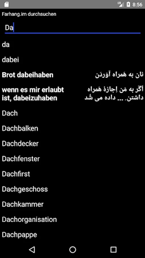 Farhang is a German / Persian dictionary with 30,000 entries and more than 75,000 translations. It can be searched for German and Persian entries.