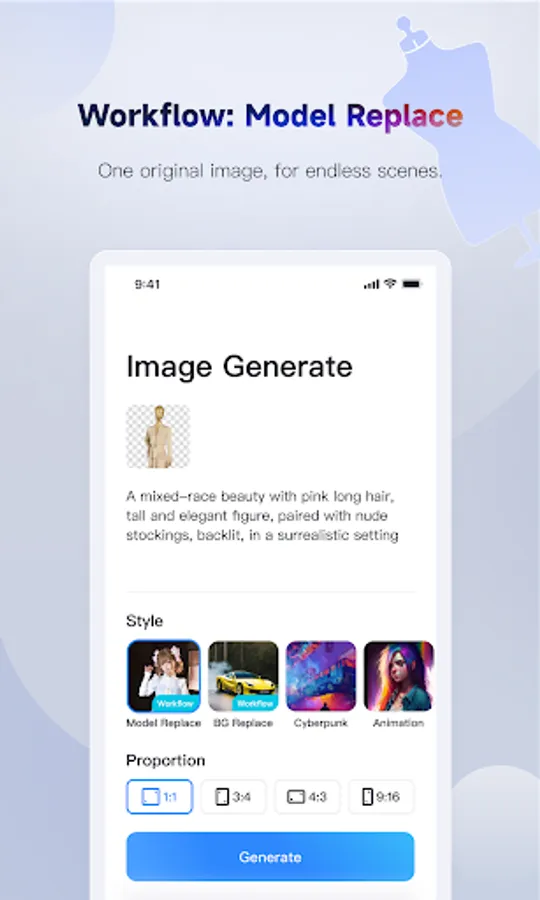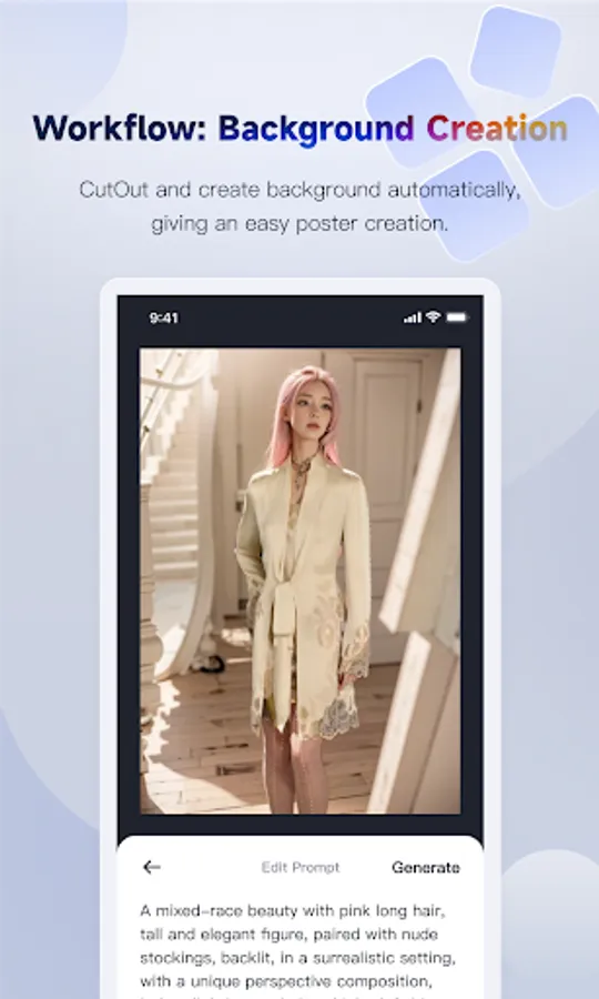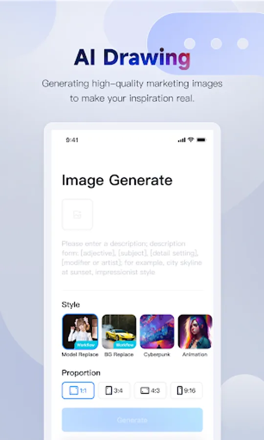 "AI Draw": Entering text or uploading basemaps to generate marketing images with various styles like cyberpunk, ACG and etc.; Support operations such as cutout, changing objects and adding poster templates.