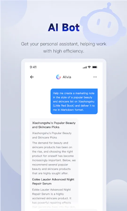 "AI Bot": Multiple types of chat bots for the generation of marketing copies through dialogue in various styles; Supports shortcuts to copy, save, and share content.