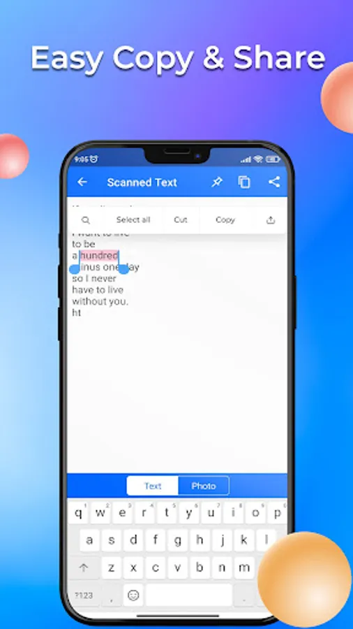 - Scan/extract text from images/photos/pictures by using phone's camera.